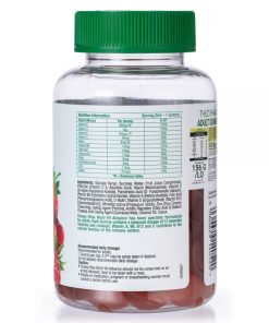 Xi-rô Glucose, Đường Sucrose, Nước, Nước ép trái cây cô đặc (Mâm xôi), Vitamins: [Vitamin C (dạng Acid L-ascorbic) 40 mg, Niacin (Vitamin B3) (dạng Nicotinamid) 8 mg, Vitamin E (dạng DL-alpha-tocopheryl acetat) 6 mg, Acid pantothenic (Vitamin B5) (dạng D-pantothenat, calci) 6 mg, Vitamin B6 (dạng Pyridoxin hydroclorid) 1,4 mg, Vitamin A (dạng Retinyl acetat) 800 µg, Acid folic (Vitamin B9) (dạng Acid pteroylmonoglutamic) 100 µg, Biotin (dạng D-Biotin) 50 µg, Vitamin D (dạng Ergocalciferol) 5 µg, Vitamin B12 (dạng Cyanocobalamin) 1,5 µg], Khoáng chất: [Kẽm (dạng Kẽm citrat) 1,5 mg, lod (dạng Kali iodid) 22,5 µg], Hương liệu tự nhiên (Mâm xôi), chất tạo gel (Pectin (440)), Chất điều chỉnh độ acid (Acid citric (330), Trinatri citrat (331(iii))), Chất chống đông vón (Sáp carnauba (903)), Dầu dừa, Phẩm màu tự nhiên: chiết xuất cà rốt đen.